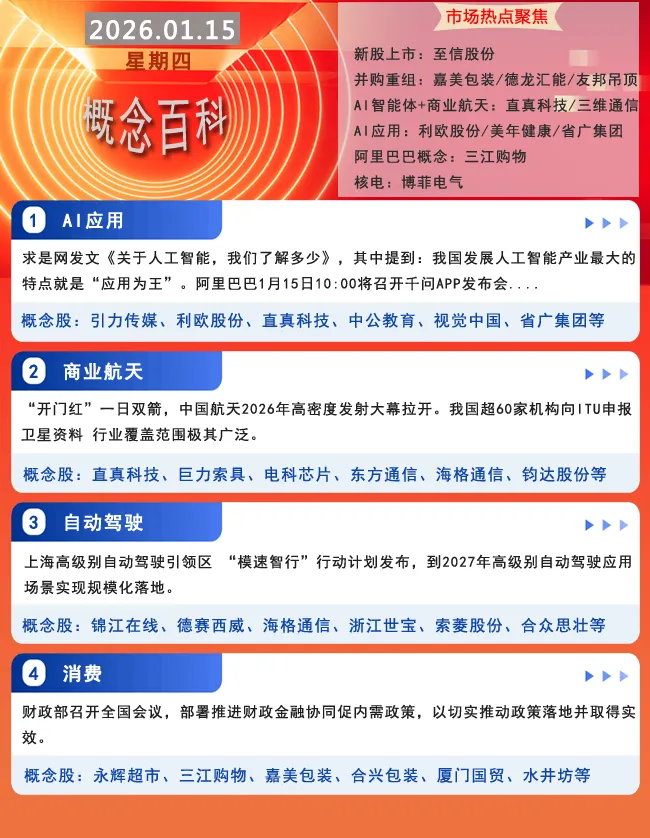 1、AI应用:求是网发文《关于人工智能,我们了解多少》,其中提到:我国发展人工智能产业最大的特点就是“应用为王”。阿里巴巴1月15日10:00将召开千问APP发布会,见证AI如何“开启办事时代”。13日,百川智能宣布发布百川M3模型,在OpenAI发布的医疗健康领域评估测试集HealthBench,反超OpenAI的GPT-5.2 High,获得 SOTA。