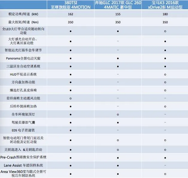 以三个款车型的顶配车型为例,通过对比,我们发现途观L在配置上还是有着不小的优势。例如:途观L像豪华品牌奔驰GLC和宝马X3一样,都配置了全景电动天窗以及三温区全自动空调系统。再就是途观L安装了先进的HUD平视显示系统,但是奔驰GLC则没有配备,而宝马X3也只是选装。同时,我们还会发现,途观L的动力性能同样很不错,足以和奔驰GLC和宝马X3相媲美。所以这样比较下来,途观L的配置优势,为其在中级SUV市场的激烈中占据不小的优势。