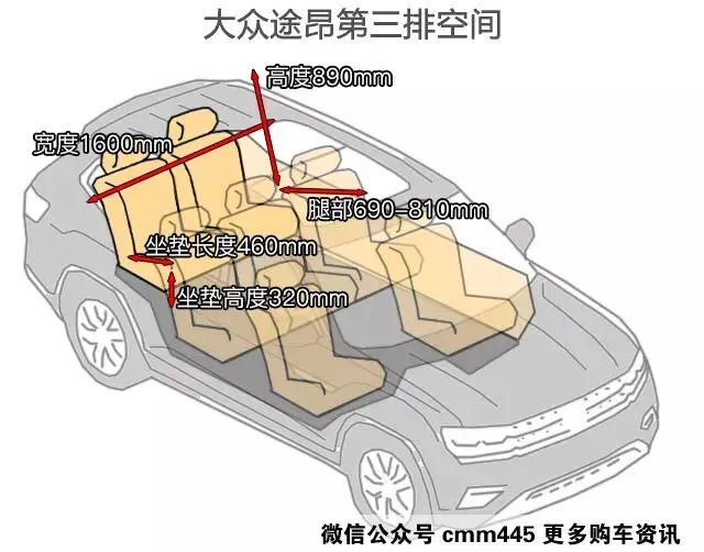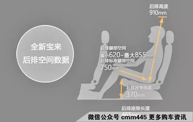 在这里先放上大众宝来后排的数据:坐垫长度465mm,坐垫高度370mm,腿部空间750mm,头部空间910mm。