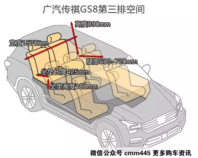 第三排空间上GS8就彻底暴露了中型SUV的属性,GS8的第三排腿部空间仅仅只有600-720mm,坐垫只有425mm长,坐垫高度只有180mm,也就是说,传祺GS8的第三排坐着是什么感觉——与板凳无异。和宝来相比的话空间差距真不是一星半点,所以假如你幻想着GS8的第三排能够达到普通轿车后排空间的水平的话,我劝你醒醒吧。