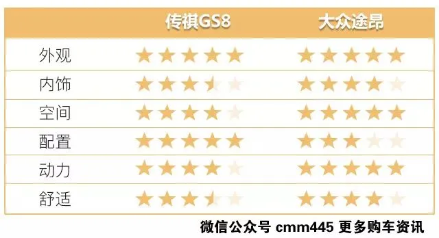 当然在其它方面,它们也是各有优劣,比如说传祺GS8的内饰软性材料使用更多,而途昂的内部储物空间则要更加大一点,在静谧性上途昂的表现则更加优秀等等,那么具体各方面的PK成绩,咱们看看这张评分表。