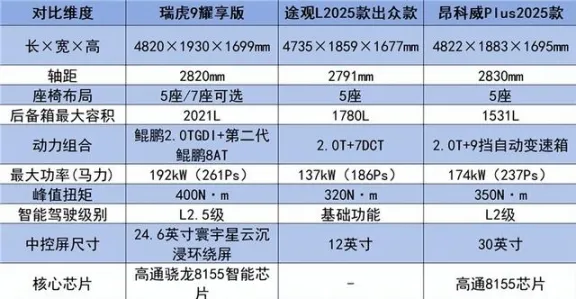 哎,说到买车,尤其是家里用,十五万上下这个价位的SUV,那可真是让人挑花眼了。这个市场太热闹了,国产的、合资的,个个都说自己好。今天咱们就拉出三台特别有代表性的车,好好唠唠。奇瑞瑞虎9的耀享版、大众途观L 2025出众款两驱龙耀版,还有别克昂科威Plus 2025款两驱白金版,把它们摆在一块儿,掰开了揉碎了比一比,看看到底哪台才是咱们老百姓过日子的实在选择。