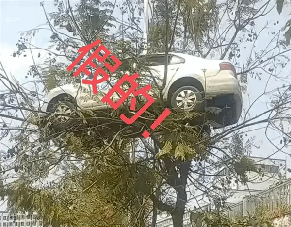 视频里,一辆白色轿车不知为何出现在一棵大树上,高高被挂在树杈上,车里还有人员被困,有吊车正参与救援,树下面则围满了人群,不少人举着手机拍摄着罕见的一幕。