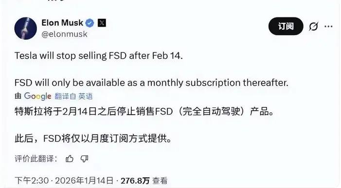 日前,特斯拉首席执行官埃隆·马斯克在社交媒体平台X上宣布,自2月14日之后,特斯拉将停止销售“完全自动驾驶”(FSD)功能的买断版本,未来该功能将仅以月度订阅制形式提供。