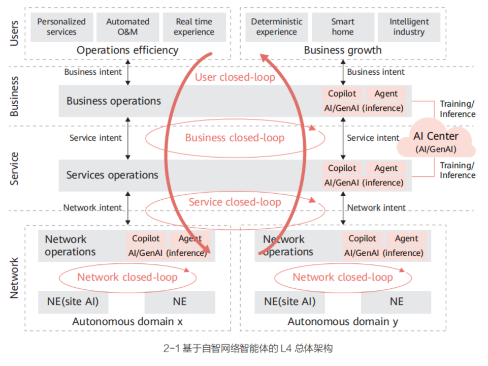 随着智能体技术的发展,网络架构也在发生深刻变革——从传统以人为中心的管理模式走向以智能体为中心的新型架构。为了实现 L4 级高阶自治网络,业界提出了一种Agentic(智能体化)架构的理念:在网络各层面部署面向不同场景的自闭环智能体,并通过上下协同来实现端到端的闭环控制。