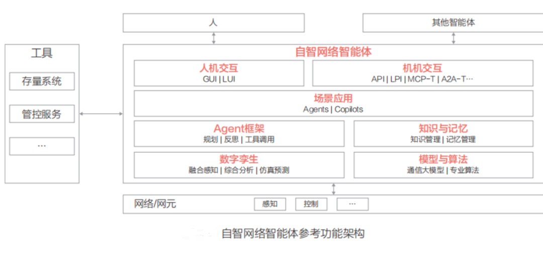 自闭环智能体(Agent):面向特定的通信网络场景,能够主动感知网络及环境状态,分析后作出适应性决策并执行控制动作,以实现用户目标的闭环系统。简单说,Agent 就是一个可以自主完成“监测-分析-决策-执行”全流程的网络机器人,不断从经验中学习优化。它作为任务的执行者,从监控分析到故障诊断、修复、优化、配置乃至仿真演练,全部自动闭环完成,是网络中的“自主工兵”。