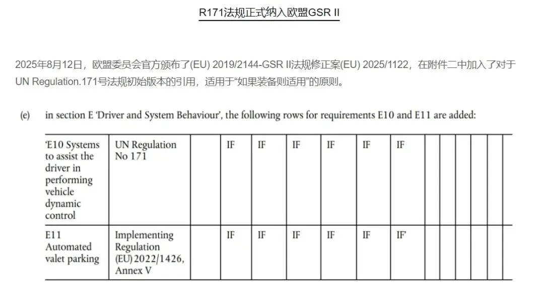 【点评】该法规的发布标志着关于驾驶员控制辅助系统(DCAS)的联合国第171号法规(UN R171)等被正式纳入欧盟车辆型式认证体系 ,标志着L2级辅助驾驶系统在欧盟正式进入强监管时代,这对制造商提出了新的挑战,同时也对规范L2级辅助驾驶系统的使用起到了推动性的作用。