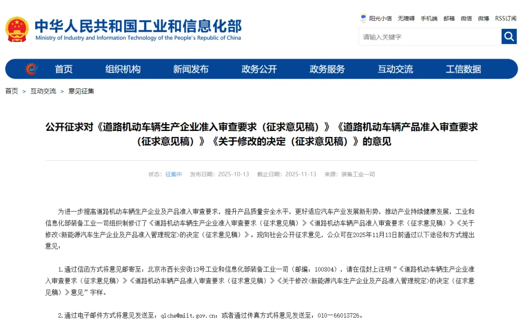 2025年10月13日至11月13日,工业和信息化部公开征求工信部征求《道路机动车辆生产企业准入审查要求》《道路机动车辆产品准入审查要求》等意见。
