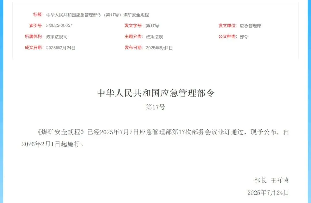 2025年7月,国家应急管理部发布《煤矿安全规程》修订版,新增“无人作业、无人驾驶”内容,并对无人驾驶作业的调度系统、稳定通信、安全距离、车速限制、作业禁止等提出要求,自2026年2月1日起施行。