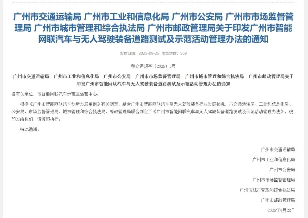 2025年9月,广州市交通运输局等六部门联合发布《广州市智能网联汽车与无人驾驶装备道路测试及示范活动管理办法》,自印发之日起实施,有效期5年。