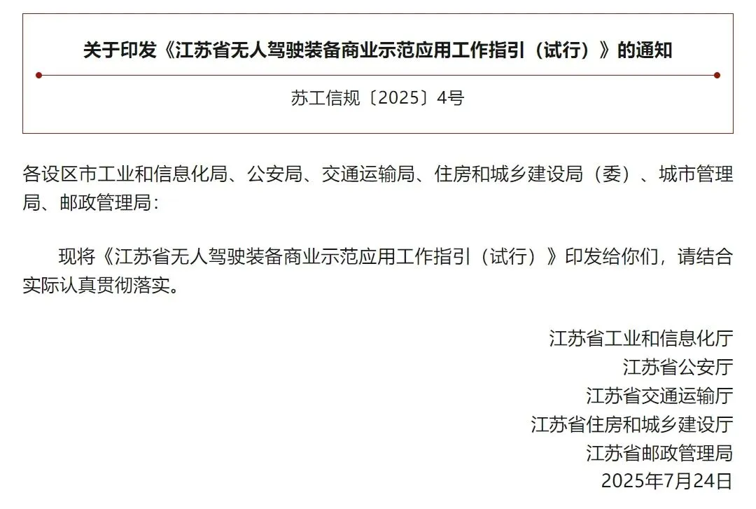 2025年8月,江苏省工业和信息化厅等五部门联合印发《江苏省无人驾驶装备商业示范应用工作指引(试行)》,自2025年9月9日起实施,有效期至2027年9月8日。