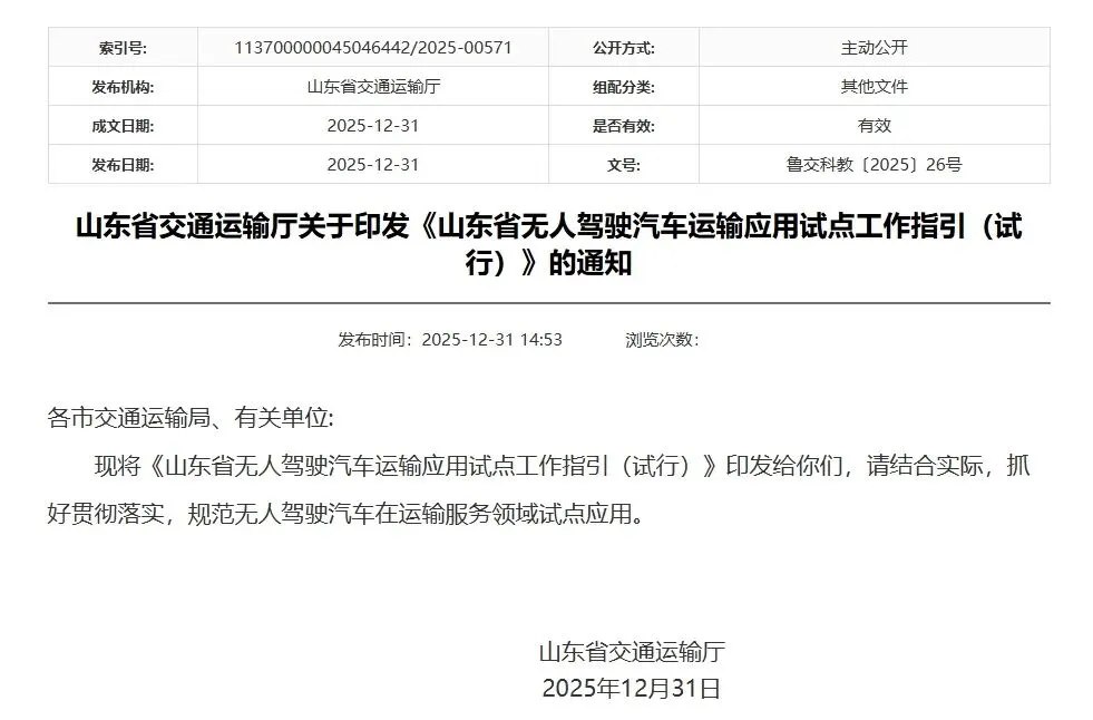 2025年12月,山东省交通运输厅发布《山东省无人驾驶汽车运输应用试点工作指引(试行)》,鼓励济南新旧动能转换起步区、青岛西海岸新区、烟台市等省级试点区域率先探索,形成可复制的“山东经验”。