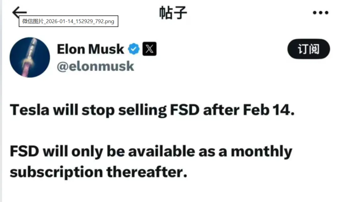 1月14日,特斯拉CEO马斯克在社交平台X上发帖称,特斯拉将于2月14日之后停止销售FSD(完全自动驾驶)产品。此后,FSD将仅以月度订阅方式提供。这是一个历史性的时刻,是顺应时代的模式转换。这样的模式转换,在历史上发上过三次。在古早的过去,人们买硬件都附带软件,IBM的大型机都是软硬件一起出售。比尔盖茨的微软打破了这一个常规,IBM兼容机和Dos系统变成分立的产品,这是第一次模式转换。软件越来越多越来越丰富,厂家研发投入越来越大,如何让客户不停为新版本付费是个大问题。甲骨文解决了这个问题,它在业界最早提出了服务费的概念。你即使已经为软件付出过一次性价格,也必须每年支付22%服务费才能拿到软件的最新版本和补丁。这是第二次模式转换。云时代来临后,软件纷纷从一次性购买模式转为订阅之按月购买,转型比较成功的包括adobe和微软。大家有没有注意到office365已经是按年销售的了,完全不是以前你去珠江路买个光盘回来装的时代。这是第三次模式转换。特斯拉汽车推出的时候,第三次模式转换正在进行中,马斯克没有想明白,才给出了买断模式。从价格上来看,特斯拉美国官网显示,FSD一次性购买价格为8000美元,月度订阅费用为199美元。买断才相当于40个月的订阅费,相对于汽车生命周期来说,这个价格的确划算。但是马斯克也没亏,他卖了这么多年,其实到现在FSD完全自动驾驶才算真正能用,这样前面花钱的人等于为他的功能提前十年掏出了真金白银。这次终于推出了纯订阅制,马斯克绝不是仅仅为了跟进软件销售模式,他是希望更多人有机会去使用他的FSD完全自动驾驶。他和董事会谈的一万亿薪酬计划中,全自动驾驶订阅要达到1000万份才生效。即使按照当下价格来说,1000万份订阅带来的纯软件收入会是每年240亿美元,可以帮助公司市值提升一万亿美元。另一方面,特斯拉汽车的销售这两年略显疲软。特斯拉销量在2023年达到巅峰(约181万辆),随后在2024年和2025年出现连续两年的小幅下滑(2025年降至约164万辆)。这主要受制于产品线老化(Model 3/Y已在此周期末端)以及全球电动车市场竞争加剧。所以,马斯克应该也希望把领先的FSD以更加便捷的方式交付给用户,反过来促进他的汽车销量。比如我,就一直没买FSD,如果有按月订阅,说不定我就会临时用几个月再说,用的好的话,说不定就会换车。可惜的是,目前在中国,FSD的一次性购买价格为6.4万元,还未提供月度订阅服务。按照美国价格测算可能会是1600一个月。同时,在价格之外,特斯拉FSD还未被批准在中国使用。好在,即使在全球销量下滑的背景下,中国市场依然占据了特斯拉全球版图的极大比重(2025年占比约为38%)。虽然2025年中国销量也有小幅回落,但相比全球跌幅,中国市场的基本盘依然非常稳固。有传言特斯拉FSD二季度可以在中国落地,我们继续观察。你们的支持才是我坚持的动力。欢迎评论,欢迎点“分享”来转发到朋友圈或者给特定人、也可以简单点击“赞”和“在看”完成推荐。万分感谢!