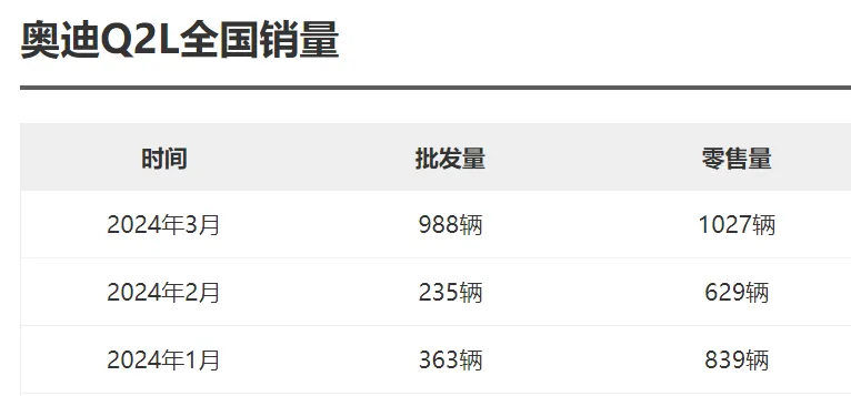Q2L是一汽奥迪一款入门级SUV,一直以来销量并不大,易车提供的数据显示。今年前三月该车的销量分别为363辆、235辆、以及988辆,不知道目前这么大幅度的让利,对成交量的帮助有多大呢?