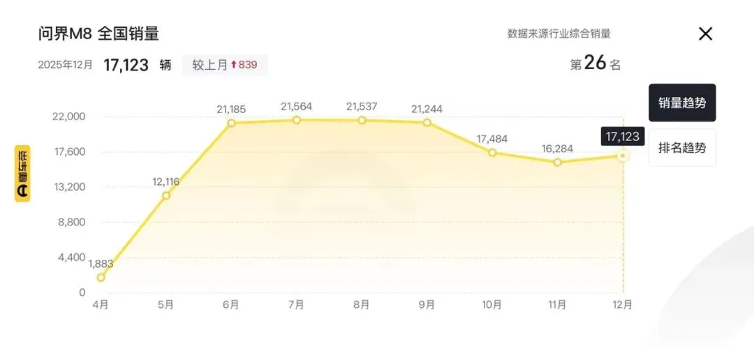 把目光聚焦到具体车型上的话,问界M8是累计销量和月均销量的双料冠军,该车2025年4月16日上市, 5月即交付破万,6月站上2万+台阶,并持续到9月份,全年累计交付15万辆,上市至年底月均销量高达17696辆。