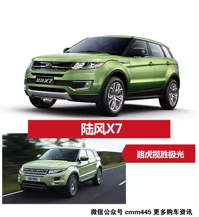 陆风X7有着一个和路虎极光相似度达到95%以上的外观。而在车头和车尾陆风X7,也使用了类似于路虎设计的land wind英文字母,而对于许多购买陆风X7的人来说,买回来第一件事便是换了全套LOGO,陆风X7开在街上远远望去还真的很像是一台路虎极光呢。