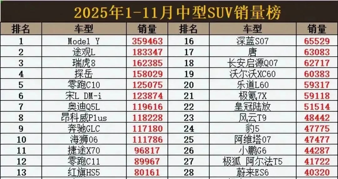 你猜怎么着?去年还吹着“国产车不行”的老司机,今年全傻眼了。2025年1-11月销量榜一出,国产新能源直接杀疯——Model Y断崖第一,瑞虎8冲进前三,连零跑C10都干翻了宋L DM-i。反观合资老将,途观L被摁在亚军位置,奥迪Q5L、奔驰GLC勉强保前十,本田P7、威飒这些“明星车型”销量惨到连6万都凑不齐。