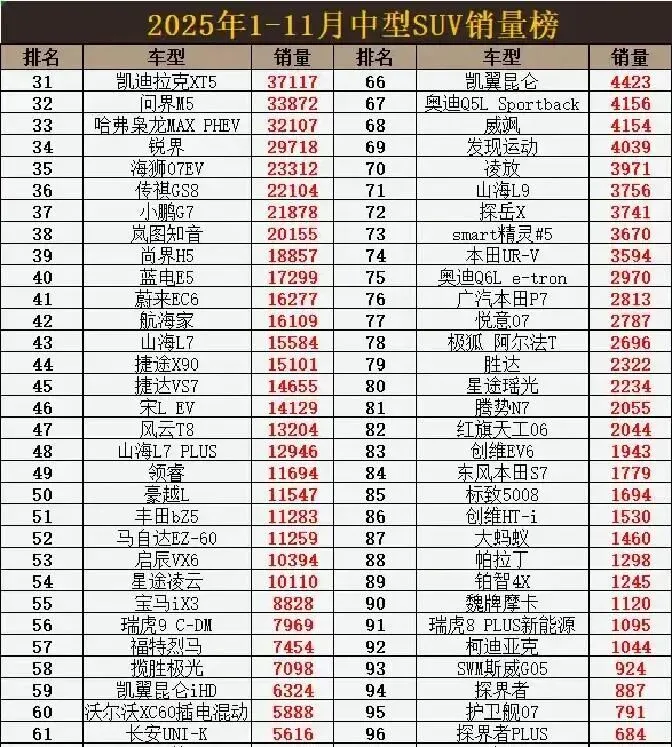 数据更狠:榜单前10名全超10万辆,Model Y直接卖了36万辆,途观L、瑞虎8都破15万,海狮06稳坐第十。但往下看就心凉了——凯迪拉克XT5靠3.7万销量在中游挣扎,问界M5、锐界销量才2万多,马自达EZ-60、星途凌云勉强破万。合资车集体失血,汉兰达、唐销量6万+,但极氪7X、豹5还在前30名死磕。