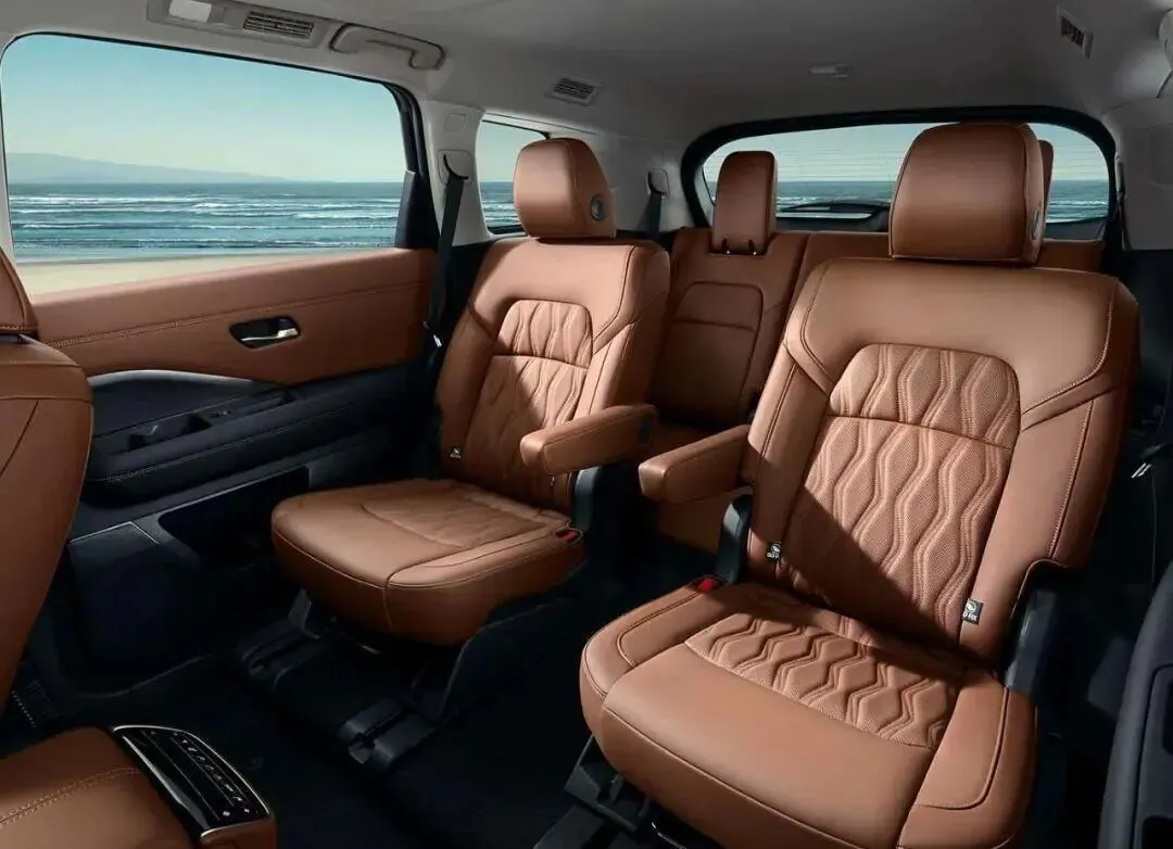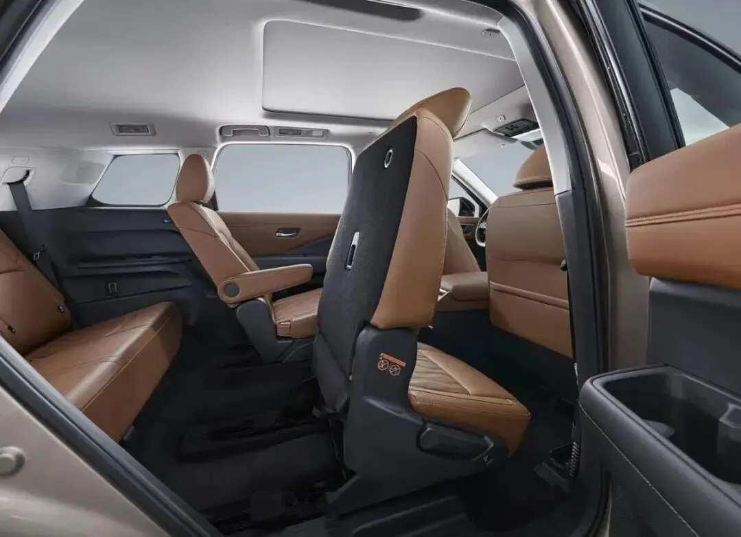 这车有6座和7座可选。6座版是两排各两个座位,第三排其实能坐三个人,但厂家把中间的头枕给去掉了,这样就合规了。不管是6座还是7座,第二排都能前后移动,靠背角度也能调。