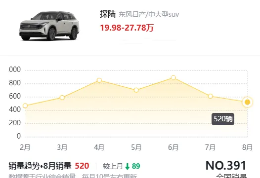 来看看销量数据,探陆8月份只卖了520辆,今年表现最好的月份也就卖出887台。说起来这车价格挺实惠,产品力也不差,还挂着日产的招牌,怎么就没人买账呢?
