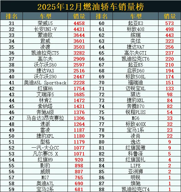 虽说国产车的市场占有率早已突破了60%,但是这其中的销量大部分来自新能源车型,在燃油车领域,国产车的销量依旧不及合资车,特别是在轿车领域,这一差距反而越来越大。据2025年12月燃油轿车销量榜显示,本次共计有88款车型上榜,其中销量破万的车型有15款之多,燃油轿车销量依旧庞大。合资车包揽前8,再次取得销量上的大胜,轩逸、朗逸、速腾稳居前3,帕萨特销量力压凯美瑞,奥迪A6L作为合资豪车代表,强势跻身前10。国产车本月在榜单的排名表现进一步下滑,艾瑞泽8成为国产车型中的领军者,红旗H5意外跌出榜单10强,星瑞、帝豪销量跌破万辆,而荣威i5甚至已排在榜单30名开外。值得注意的是多款传统燃油车豪强表现不佳,宝来排名无缘前20,卡罗拉、思域险些被挤出前30名,销量也都不足5000辆。从榜单数据来看,轩逸、朗逸、速腾依旧稳居前3,三者销量都超2万辆,表现出色,但三者之间的销量差距也在不断缩小,争夺销冠的竞争也越来越激烈。帕萨特和凯美瑞之间的B级车销冠之争也是如此,两者本月都交出了1.9万辆的销量,奥迪A6L、雅阁、迈腾也表现不俗,艾瑞泽8反超逸动,两者成功跻身前10,此外亚洲龙、宝马3系、奔驰E级销量破万,星瑞、天籁成功入榜前20名,伊兰特、MG5、领克03等也都稳居榜单前列。蒙迪欧、君威两款美系轿车都是3600多辆,凌渡仅位居第35名,高尔夫、捷达VA3只有2000多辆,红旗H6、艾瑞泽5已排到榜单40名开外,马自达3昂克赛拉、雷凌已到了无人问津的地步,型格销量勉强破千,威朗仅售出807辆,起亚K3、标致408都成为了车市的冷门车,起亚K5只有210辆的销量,骐达、奔腾B70、凌尚等车型月销都不足百辆,市场表现非常惨淡。