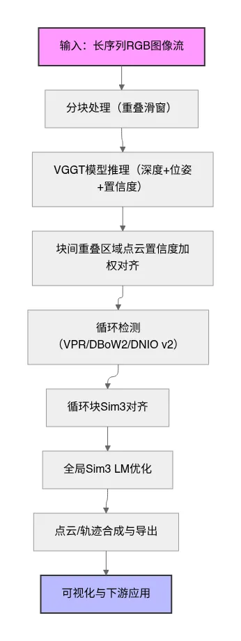 下面是VGGT-Long的系统流程图,展示了从输入到输出的全链路处理过程: