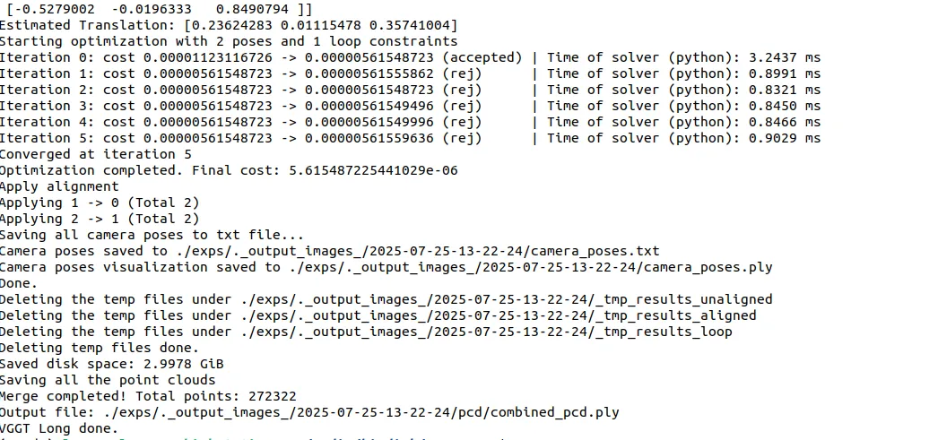 extrinsic, intrinsic = pose_encoding_to_extri_intri(predictions["pose_enc"], images.shape[-2:])predictions["extrinsic"] = extrinsicpredictions["intrinsic"] = intrinsic# 张量转numpyfor key in predictions.keys(): if isinstance(predictions[key], torch.Tensor): predictions[key] = predictions[key].cpu().numpy().squeeze(0)通过上述推理引擎设计,VGGT-Long不仅保证了基础模型的高效运行,还为大规模三维重建任务提供了坚实的算力与数据基础。