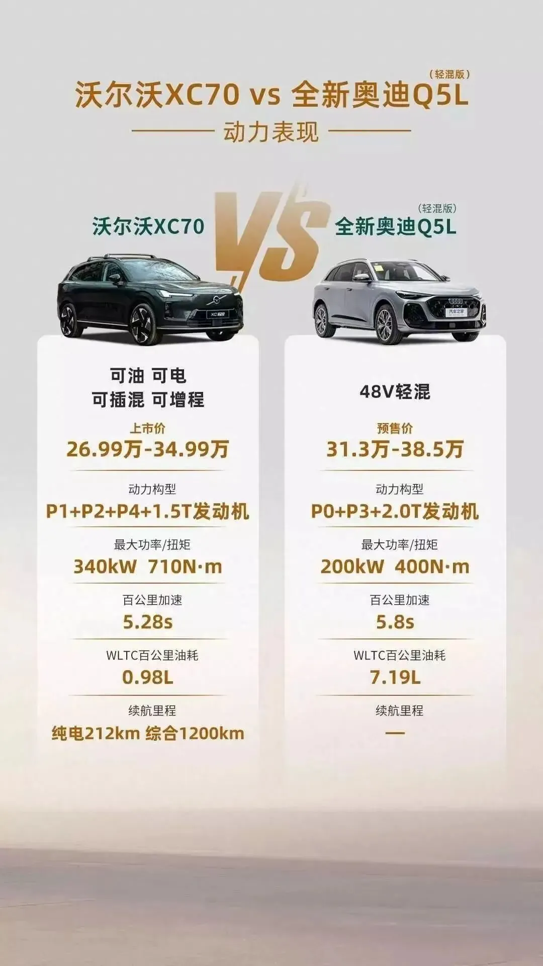在 48V 轻混系统的加持下,45TFSI 车型的燃油经济性得到了显著提升,WLTC 综合油耗低至 6.9L/100km ,同时,轻混系统还能在车辆启动和低速行驶时,提供额外的动力辅助,使得起步更加轻盈,加速更加顺畅。在性能方面,45TFSI 车型的零百加速仅需 6.7 秒,这样的成绩在同级别车型中表现出色,展现出了全新奥迪 Q5L 强大的动力性能。无论是在城市道路中穿梭,还是在高速公路上驰骋,全新奥迪 Q5L 都能轻松应对,为驾驶者带来激情与舒适并存的驾驶体验。二、新能源豪华破局者:沃尔沃全新 XC70 的全周期价值攻势。混动核心:SMA 架构超级混动,告别续航焦虑。沃尔沃全新 XC70 基于沃尔沃全新研发的 SMA 超级混动架构打造,这套架构凝聚了沃尔沃全球技术资源与对中国市场需求的深刻洞察,是原生混动技术的集大成者 ,从根本上解决了传统插混和增程式混动的诸多痛点。