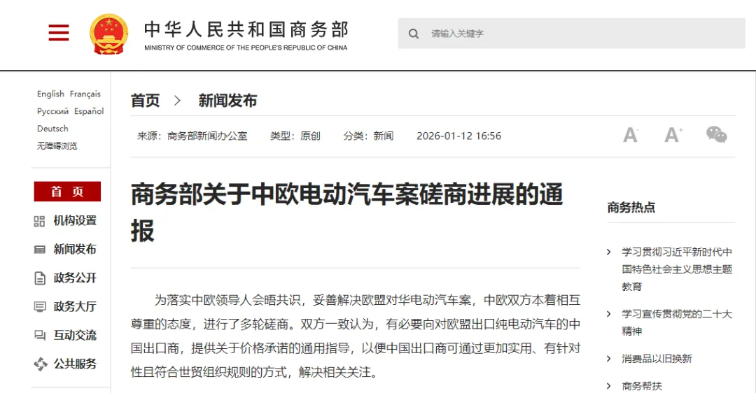 中国电动汽车关税问题迎来关键进展。1月12日,商务部发布《商务部关于中欧电动汽车案磋商进展的通报》,该通报显示,经过多轮磋商,中欧双方已达成共识,将借助“价格承诺”机制以解决相关分歧。欧盟将发布《关于提交价格承诺申请的指导文件》,中国电动汽车企业可依据指导文件内容提交价格承诺申请,如与欧方达成价格承诺协议,或可免征反补贴税。