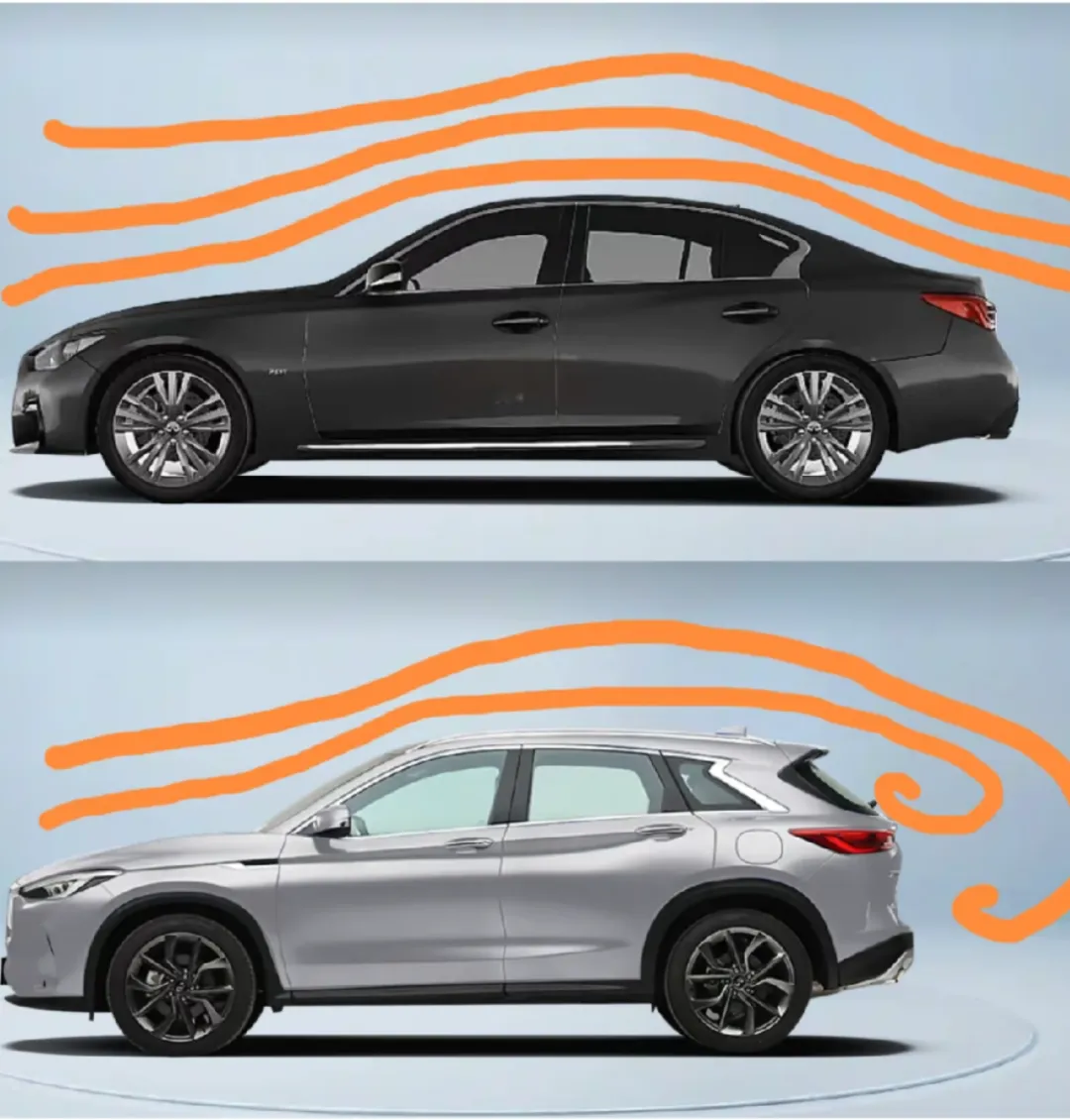 那三厢车就没有这种情况了吗?是的,没有。三厢车由于后车窗玻璃是倾斜的,并且后面还有一段延伸出去的行李箱盖。当车子往前走,气流从车顶流过后,由于玻璃缓慢往下倾斜,那么大部分气流也会沿着玻璃下来,到了后备箱盖处,再往后方吹去。