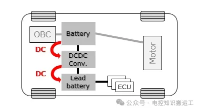 EV的所有设备都依靠电来工作。行车用马达等依靠大型/高电压的锂离子电池的电力来工作,其他大量车载设备(ECU、摄像头、车灯等)依靠低电压的铅酸电池的电力来工作。铅酸电池如果不充电就会没电,所以需要从锂离子电池充电。其中将高电压直流电转换为低电压直流电的设备就是DC/DC转换器。通过转换为低电压,EV的各种车载设备就能在适当的电压下工作。