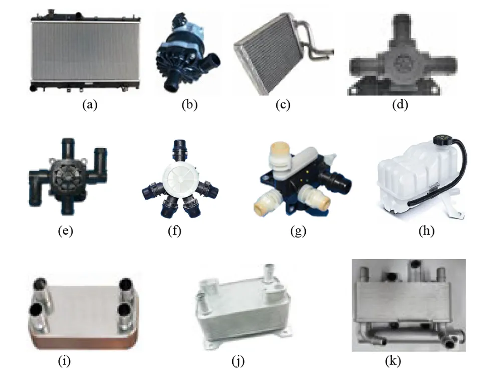 图 5 冷却系统组件:(a)散热器;(b)冷却液泵;(c)加热器芯;(d)三通阀;(e)四通阀;(f)五通阀;(g)六通阀;(h)缓冲罐;(i)冷却液 - 冷却液热交换器(j)冷却器(k)水冷式冷凝器