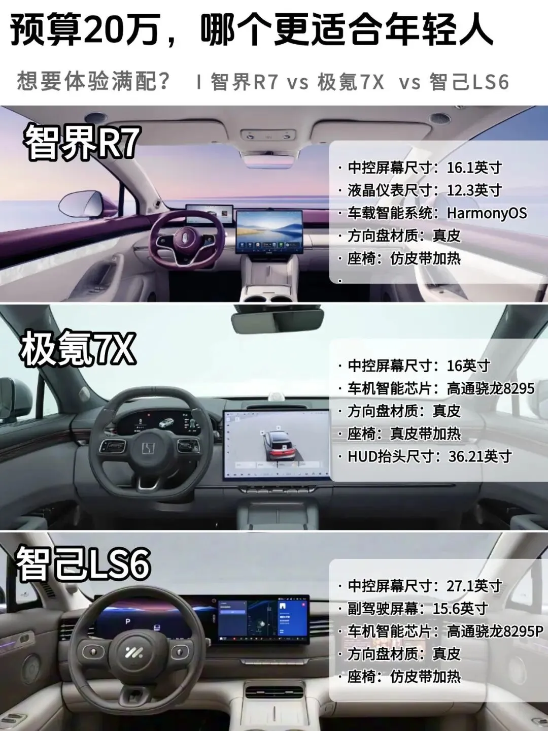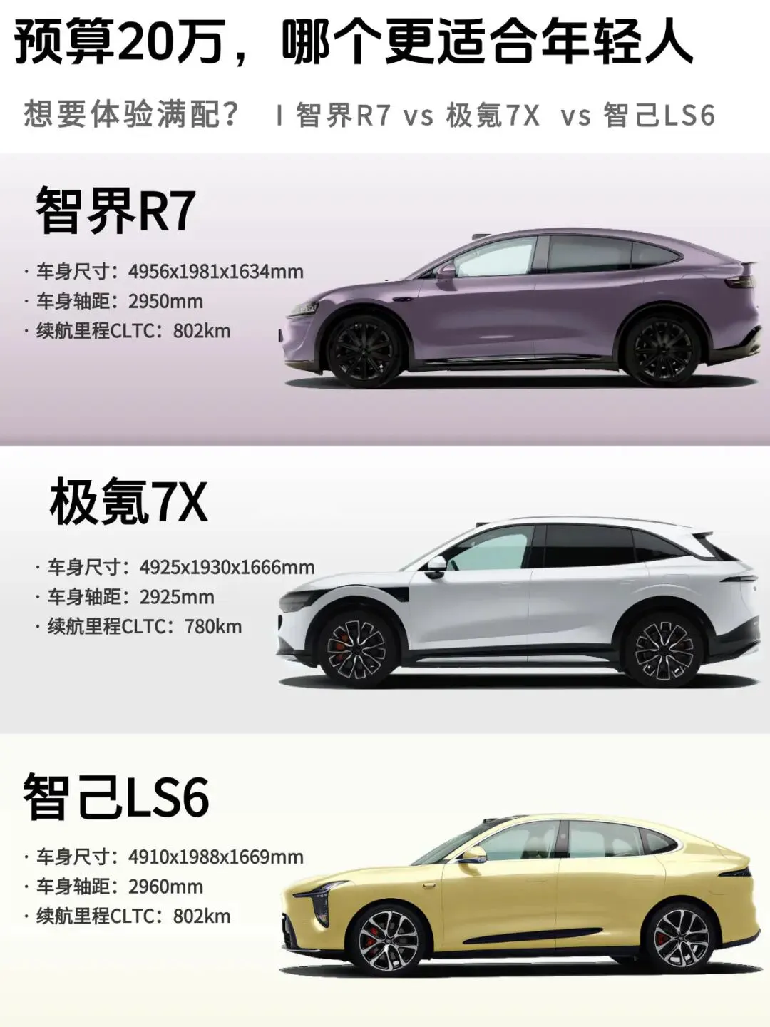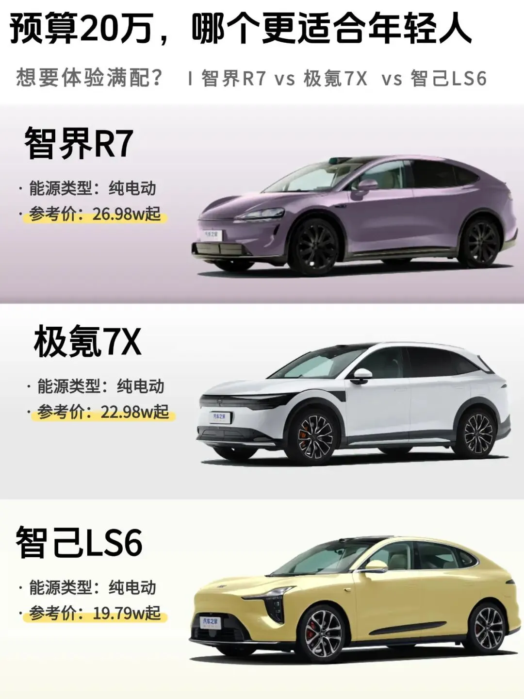 20-30万纯电SUV市场,智界R7纯电Pro版、极氪7X后驱智驾版、智己LS6灵蜥智驾版各有千秋,纠结党可按核心需求对号入座。 智己LS6灵蜥智驾版性价比拉满,19.49万起售,标配激光雷达与高速、城区NOA智驾,零重力座椅、冷暖箱等配置齐全。灵蜥数字底盘+后轮转向,让中大型SUV灵活好开,转弯半径小巧,城市通勤无压力,适合追求全能配置与低预算的年轻人。 极氪7X后驱智驾版22.99万起,SEA浩瀚架构加持,前双叉臂+后五连杆底盘紧致,操控有德系质感。800V高压平台适配快充,智驾硬件到位,仅城市功能待上线,适合看重驾驶质感与长途补能效率的家庭。 智界R7纯电Pro版25.98万起,华为途灵底盘标配CDC+空悬,滤震沉稳。鸿蒙车机生态互联流畅,科技感拉满,但入门版仅支持高速智驾,需加购智驾包,更适合华为生态用户与预算充足、偏爱豪华质感者。