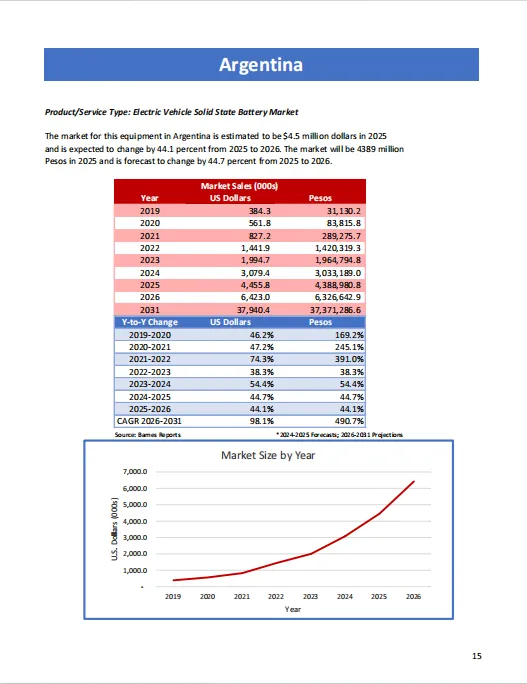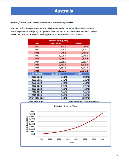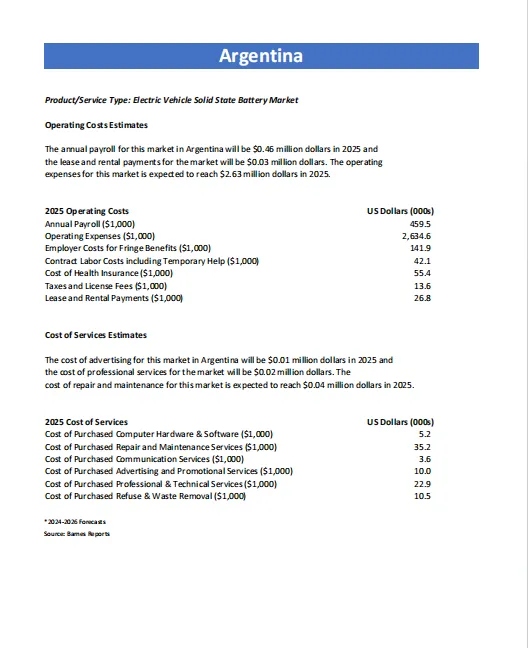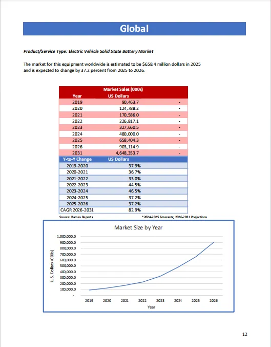 各国市场成本结构呈现共性与差异,运营成本中年度薪资和运营费用均占主要份额,服务成本则以广告推广、专业技术服务、维修保养为核心支出。从长期趋势看,全球及各区域、国家市场均将保持高速增长,2031 年市场规模较 2025 年将实现数倍增长,展现出电动汽车固态电池市场广阔的发展前景与巨大的市场潜力。