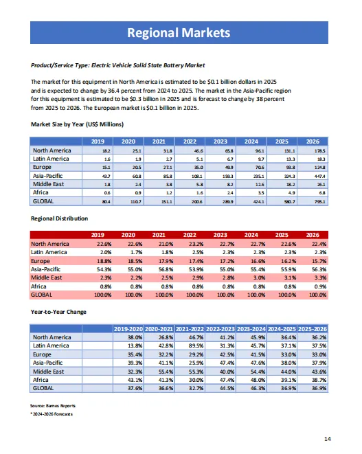2025 年全球电动汽车固态电池市场呈现高速增长态势,市场规模与区域布局均展现出鲜明特征,成本结构与未来潜力清晰可辨。