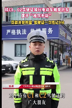 近期,部分官方平台发布短视频持C1、C2驾驶证骑行电动车会罚款并拘留驾驶证扣9分。