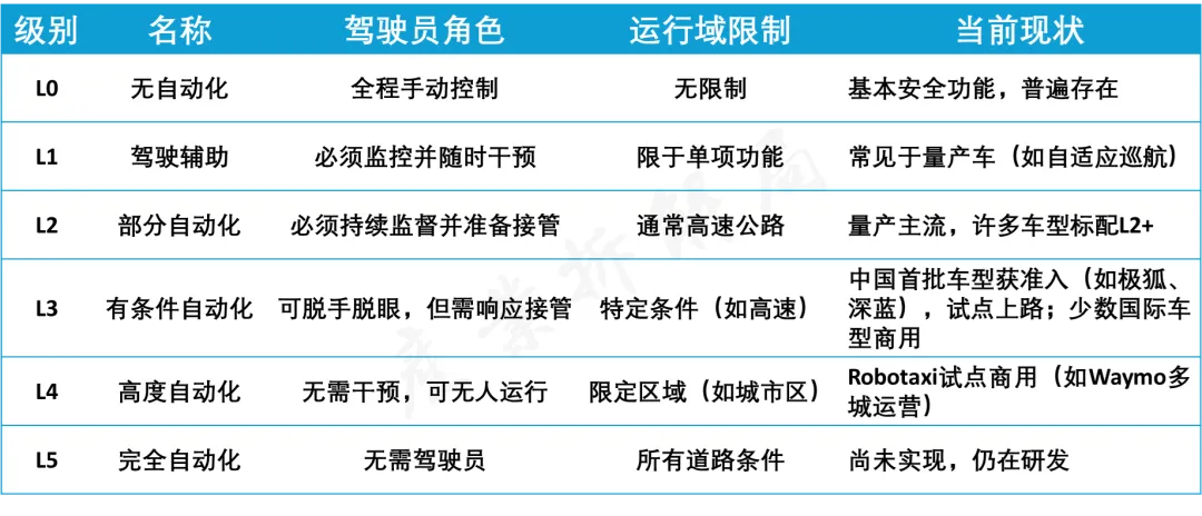 在技术分级上,自动驾驶按照美国汽车工程师协会(SAE)定义可分 L0-L5 六个等级,等级越高车辆可实现越多自主驾驶功能。L5 代表完全自动驾驶,无需人类干预,而当前多数量产系统主要处于 L2/L3 阶段。