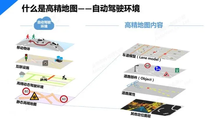 高精地图(HD Map)与实时定位为自动驾驶提供高度结构化的环境信息。与普通导航地图不同,高精地图包含车道级几何信息、坡度、路侧标识等精细语义数据,可实现厘米级定位,为规划模块提供“空间语义参考”。