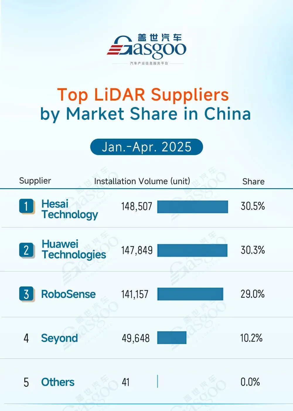 2025年,中国激光雷达品牌占据全球乘用车市场90%以上份额,头部企业有禾赛科技、速腾聚创、华为、图达通。