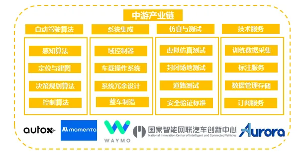 自动驾驶产业链中游主要聚焦于技术集成与优化环节,包括自动驾驶算法开发、系统集成、仿真与测试、技术服务等部分。这些环节连接上游硬件(如传感器、芯片)与下游整车应用,强调软件硬件融合与验证。