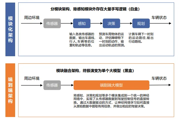 单车智能正逐渐由传统的“模块化”架构(感知→规划→控制逐层拆分)演进为“端到端”大模型架构,直接从传感器原始数据映射到车辆控制指令,大幅提升复杂场景泛化能力和决策效率,已成为2025年后算法主流方向。