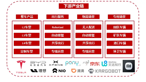 自动驾驶(产业链下游主要聚焦于商业应用与终端落地,包括整车产品、出行服务、物流场景以及其他专用场景。