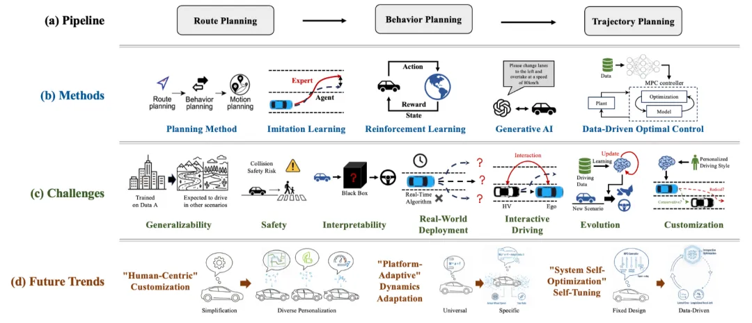 这些目标经常互相拉扯:越强调形式化安全约束,越容易保守;越追求更像人,越可能变得黑盒。学习式规划方法的意义就在于尝试在这种矛盾中找到新的平衡点。