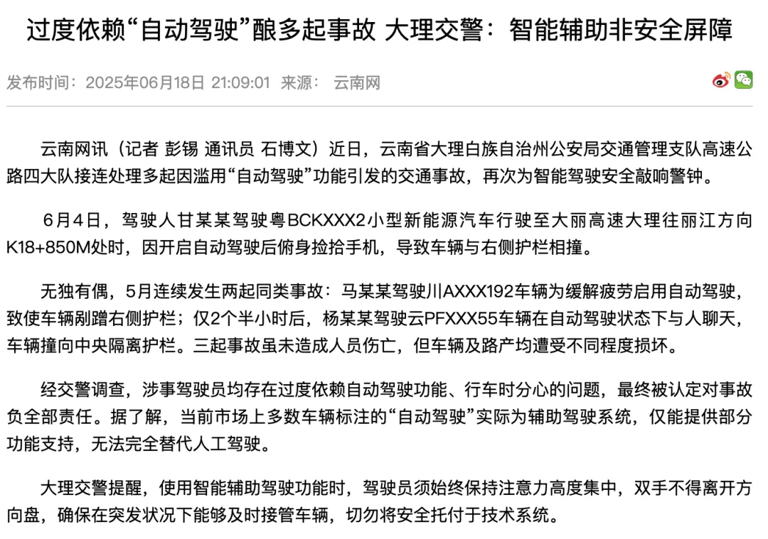 但另一面,辅助驾驶事故频发的新闻却让人揪心:浙江宁波司机开着辅助驾驶睡着撞护栏,云南高速上因依赖自动驾驶捡手机、聊天接连引发碰撞事故。