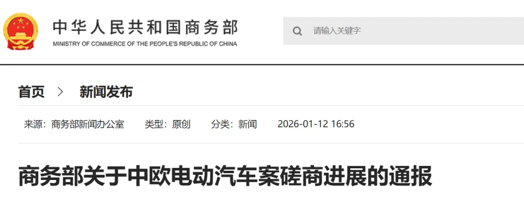 2026年1月12日,商务部发布“关于中欧电动汽车案磋商进展”的通报,宣布双方已就欧盟对华电动汽车反补贴案达成重要共识。欧委会于2023年10月正式对中国电动汽车发起反补贴调查,原计划可能征收的关税幅度备受市场担忧。