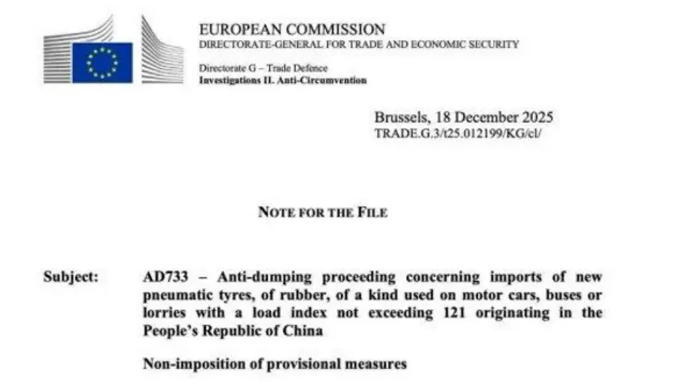 2025年12月18日,部分媒体报道显示,欧委会决定对来自中国的乘用车和轻卡轮胎不采取临时措施,但强调将继续调查有关倾销的指控。