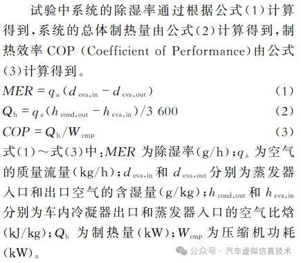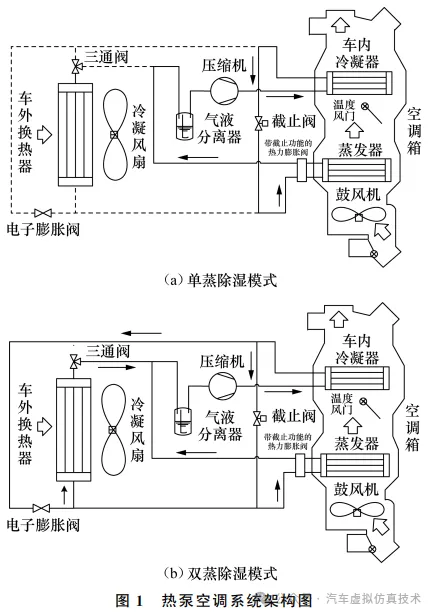 汽车空调作为汽车的重要子系统之一,主要作用为控制和调节乘员舱内空气的温度、湿度、流量和清洁度。其中,对湿度的调节一是为了使空气湿度保持在舒适范围,二是为了避免车窗玻璃起雾影响驾驶员视线。汽车空调的除湿过程为首先使外界环境中的湿空气流过蒸发器,水蒸气在蒸发器表面凝结并排出,然后使流过蒸发器的空气再经过加热器加热到合适的温度从空调箱进入乘员舱,因此除湿功能实际上包括了除湿和加热两个过程。不同于传统燃油车,电动汽车的能量基本都来自动力电池,因此,在冬季加热需求高时严重影响续航里程。