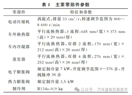 参照电动汽车实车标准搭建热泵空调系统台架(图1),将台架置于环境气候仓中进行测试。该环境仓可模拟-20℃至60℃的环境温度,同时在0℃以上环境下可在30%~95%的范围内任意调节相对湿度。系统台架的主要零部件特征和参数如表1所示。