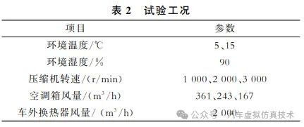 试验方法为首先开启环境气候仓机组至设定的环境温度和湿度条件,然后由热泵控制系统控制各电气零件至设定的参数进行除湿操作,待系统达到稳态后记录相关数据。考虑到不同环境温度条件下空气的含湿量以及乘员舱的制热需求差异较大,文章研究了环境温度分别为5℃和15℃条件下不同压缩机转速、电子膨胀阀开度以及风量对除湿性能的影响,测试工况如表2所示。