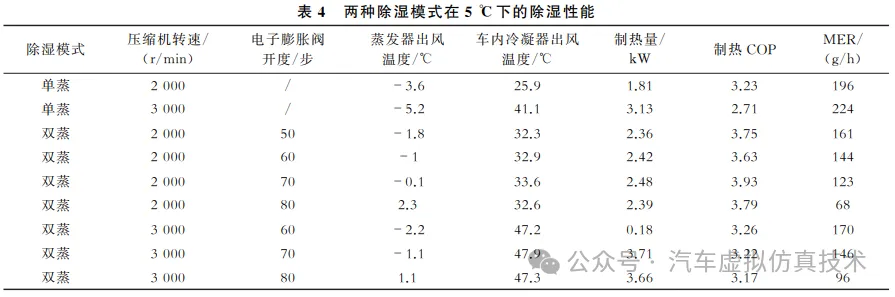 从表5可见,在单蒸模式中不同压缩机转速下的除湿能力均能充分满足乘员舱的除湿需求,蒸发器出风温度显著高于0℃从而不会有结霜风险,因此可以直接通过控制压缩机转速来控制制热量从而有效控制空调箱的出风温度。在双蒸模式下,为了实现较高的除湿能力需要将电子膨胀阀的开度调到很低,但此时系统制热能力将明显降低,因此相对于控制更加简单的单蒸模式并无性能优势。从表5可以看到,双蒸模式下当电子膨胀阀开度开到接近最小开度40步时,系统的制热能力与单蒸模式相当,而除湿能力却降低了26%。如果提高开度到60步,尽管制热能力提高了18%但同时除湿能力仅为62g/h,基本无法满足较高温度下乘员舱的除湿需求。